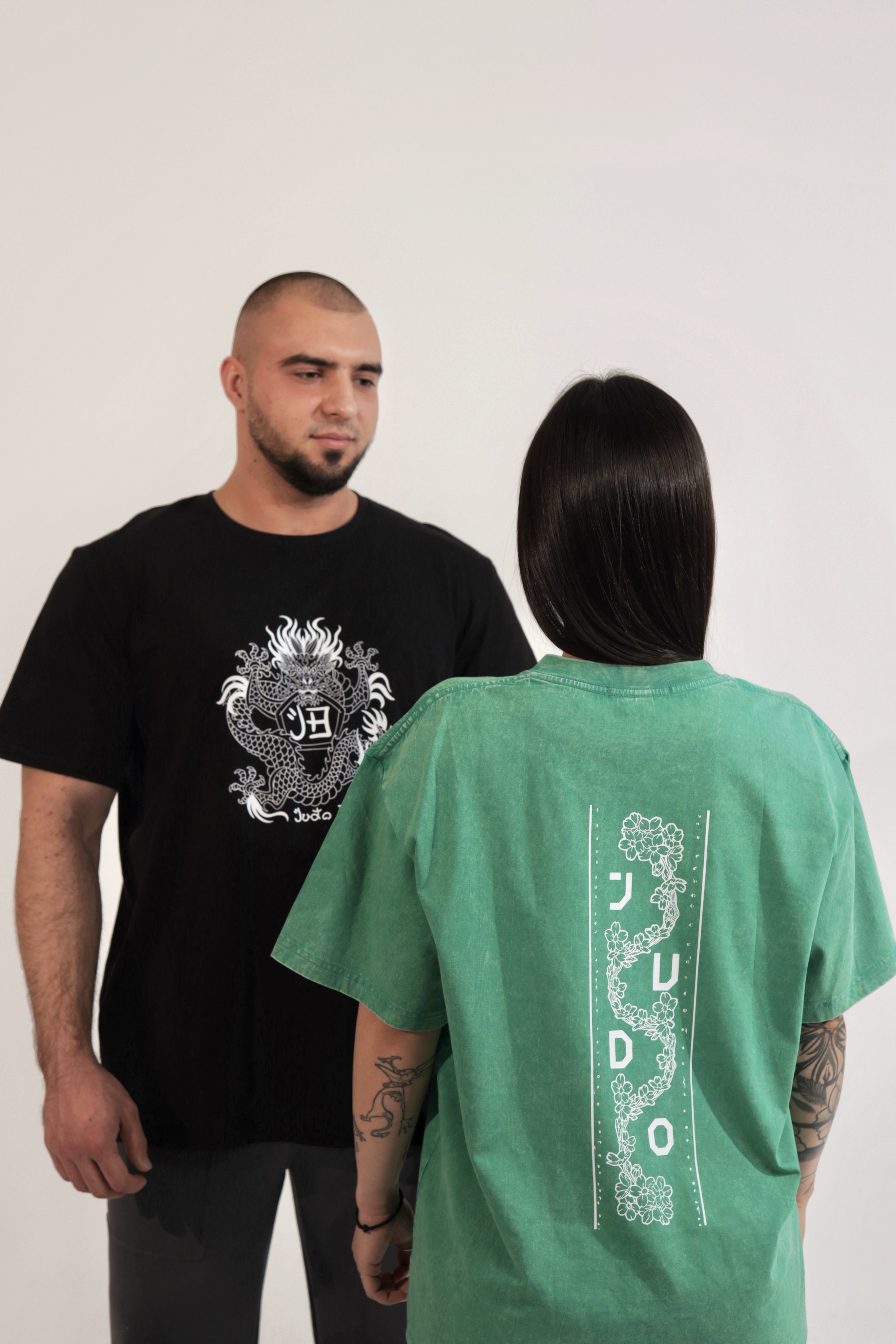 Вертикальная надпись JUDO, вплетённая в цветочную линию — символ того, что путь каждого уникален, но корни у всех один: уважение, дисциплина и чистота намерений.